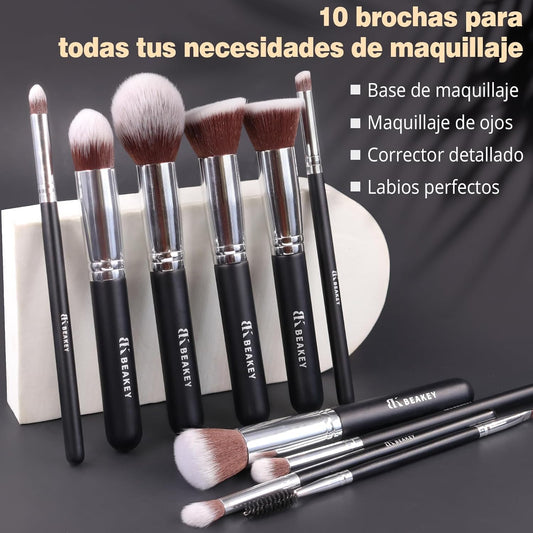 BEAKEY Set De Brochas De Maquillaje Profesional, 10+2 Brochas Sintéticas Para Base, Polvos, Ojos, Rubor Y Contorno, Con Esponja Blender (Negro/Plateado)